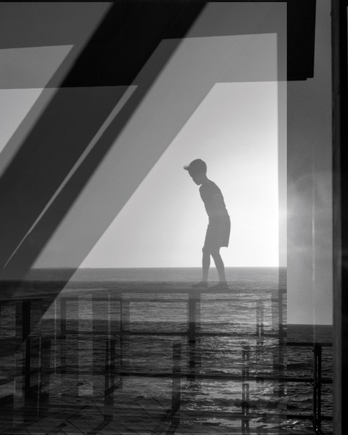 A daredevil shows his skill at walking the rail in this double Exposure and composite