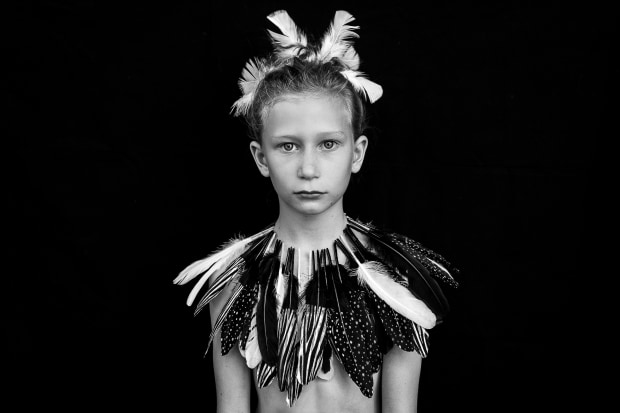 I found some beautiful feathers which I knew would work well in black and white, and I wanted to make them into a necklace so that it would fan out around them, resembling a cloak. I wanted to evoke the presence of traditional warriors, as my daughter stares out and gazes directly at the viewer. She has a strength of spirit, and like the feather cloaks she wears, she is strong, fragile and beautiful.
