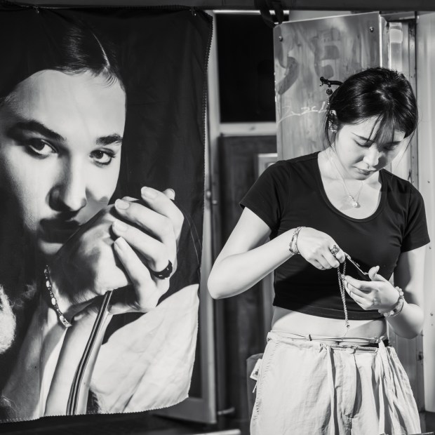 Friday night markets in Chinatown, Sydney, are a famous late-night shopping hotspot. You will find vendors selling a variety of goods as well as food stalls offering anything from desserts to freshly made Asian meals. I noticed this stall holder placing a necklace back into it's holder after showing a client. I purposely included the poster of the woman looking back at me.