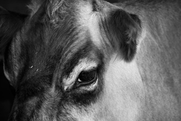 A close up of a cow's face, showing an eye and ear