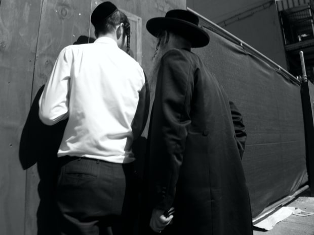 Two men, in Brooklyn, peer into the window of a construction site