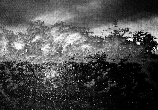 I took this photo noticing the interesting landscape style patterns the rain shower was creating on the fly wire door.