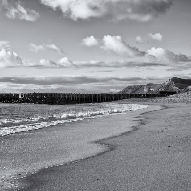 West Bay Pier, Dorset UK, and cliffs in January sunshine