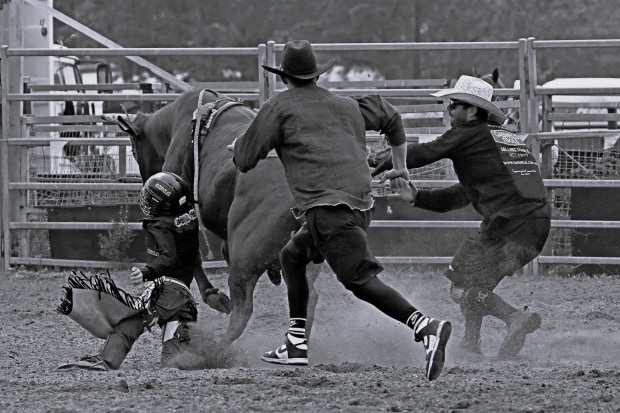 The Rodeo clowns (bullfighters) were quick of the mark to help this young boy that had been bucked off and was being dragged along. He did get to his feet shortly after I captured this image.