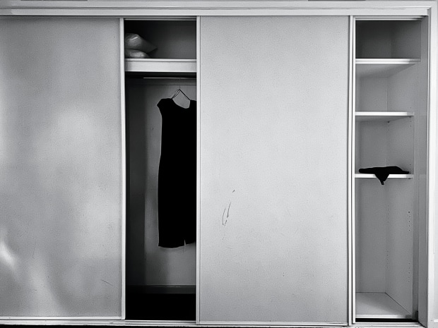 This image reflects what items survivors are sometimes left with after fleeing perpetrators. An empty cupboard and very little clothing.