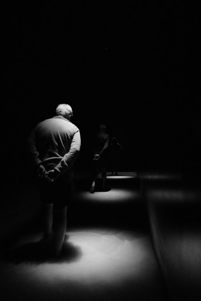 This picture was captured using my I-Phone at Team-labs in Japan, walking through a passageway in the building. It was not a posed photo but rather a snapshot of three people walking in front of me, I like the solemness that the timing of the photo created , hands clasped behind their backs and the spotlight creating dark shadows on the ground and the darkness of the narrow walk way.