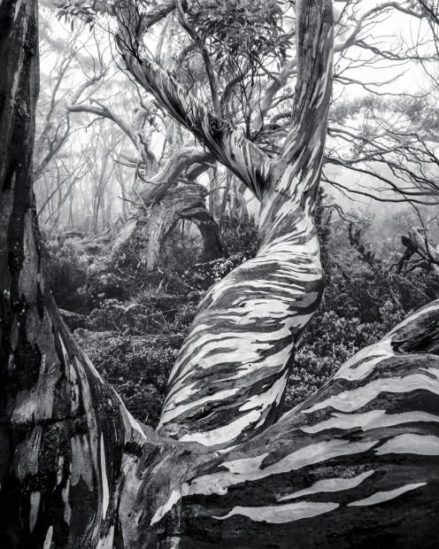 Snowgums, thriving in the harsh alpine regions of southern Tasmania, exemplify resilience and strength against the extreme weather they face. Surrounding this exposed ridge are many fallen trees, remnants of bushfires and the passage of time.