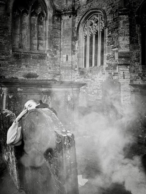 In a foggy, timeworn cemetery, a person's face partially emerges from behind a weathered gravestone, with a Gothic church's window looming silently in the background, creating a haunting, atmospheric scene steeped in mystery.