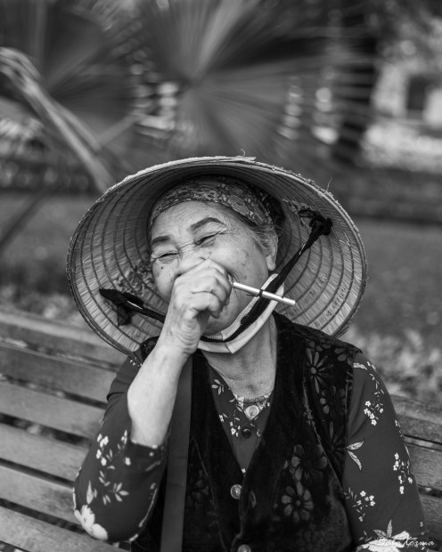 Under the dappled shade of a park tree in Hanoi, an old woman sits on a low wooden stool, her frail hands deftly arranging a collection of small, hand-carved whistles on a worn bamboo mat. Her face is lined with deep wrinkles, each one telling a story of decades spent in the heart of the city’s ever-moving tide of life. A conical nón lá hat shades her sharp, watchful eyes as she watches the passers-by with quiet patience. I walked up and asked permission for a photo and she burst out laughing in surprise. Canon EOSR 50mm F2.8