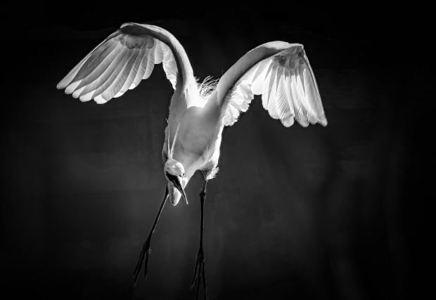 A white egret gradually unfolds its wing and legs to gracefully fly over a wetland.