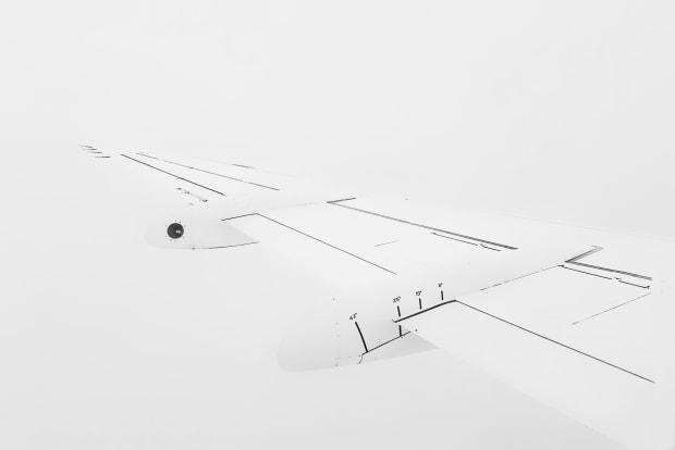 Looking out the plane window. White wing on white clouds.
