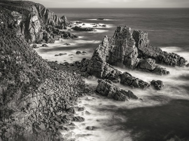 Standing on the peak above The Pinnacles at Cape Woolamai is an experience of sublime beauty and spectacle. The rocky outcrops are a delight to contemplate as the wild seas crash on the coastline boulders below. The elements of this coastline are almost perfectly positioned for a perfect composition in my camera viewfinder. Better still, I’ve always thought the best images of this wild coast are monochrome pictures. The beautiful detail and rich textures adds a depth that only monochrome can bring to life.