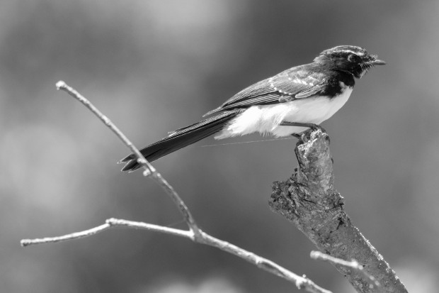 Was Taken in Narooma NSW South Coast. Will Wagtail was just hopping from branch to branch. It was a warm sunny day. Black and white just suited the photo especially as the bird is black and white.