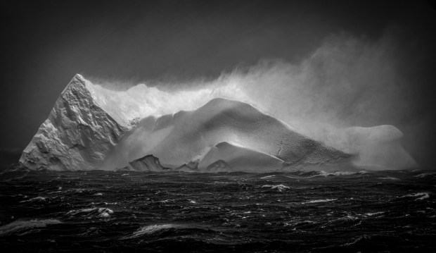 Howling wind blows the snow off an iceberg which has tipped over in the Antarctic.