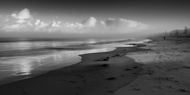 A foggy winter morning with the sun raking across the sand at Henley Beach, Adelaide