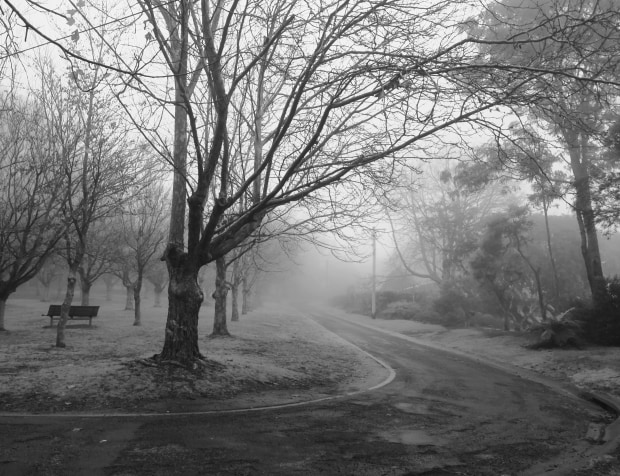 Empty street and park on a cold foggy morning. This streetscape captured for me the moody emptiness brought on by isolation during the pandemic