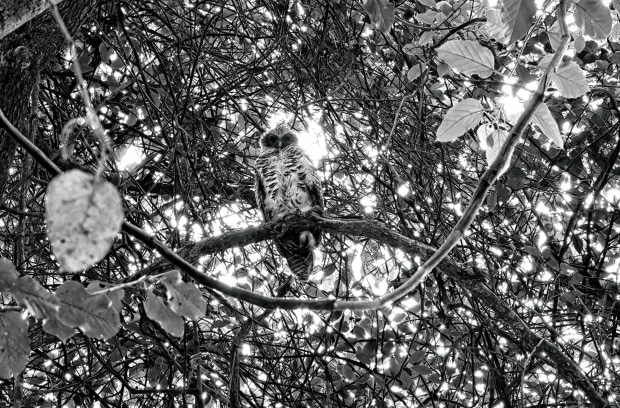 Tucked within the layered mid-storey of a tangled forest canopy, a Powerful Owl (Ninox strenua) rests in quiet stillness — immersed in the layered stillness of its habitat, shrouded by a web of leaves, vines, and branches. Its presence signals a healthy forest and the rich biodiversity it sustains. Location: Forested reserve, Sydney’s Northern Beaches.
