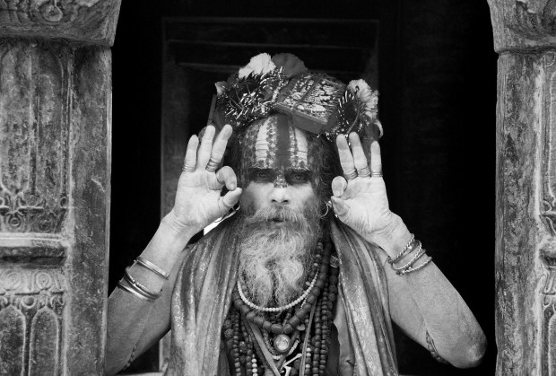 The image was taken on an analog camera while visiting The Crematoria Pashupatinath in Kathmandu. Many older men dress in traditional clothing and beg for money or trick you by posing, wait until you've taken a photo then kindly ask for money.