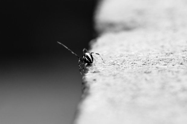 A young redback spider explores nooks and crevices of a garden retaining wall in search of the best spot for its web, and best chance of survival.